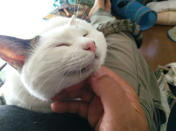現在も膝の上で一生懸命グルーミングしているんです