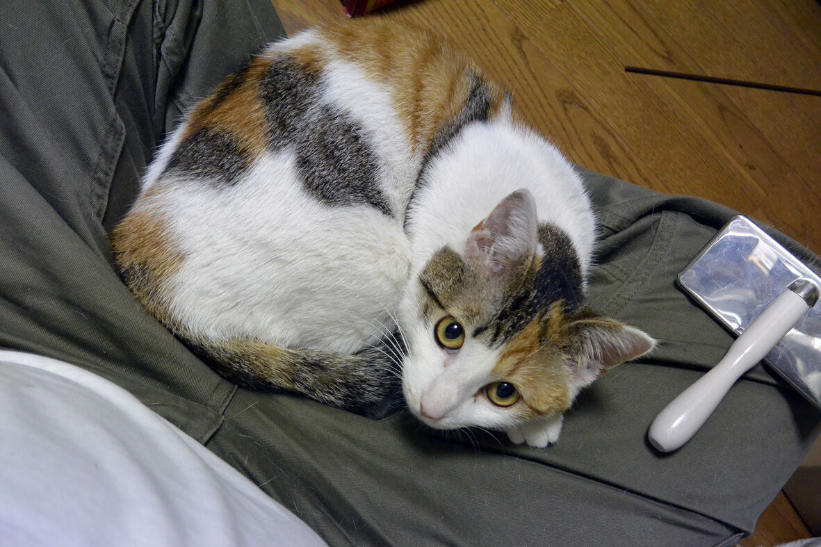 マーラ3 2020年08月18日 捕獲した三毛猫は病院へ ... 続きを読む 捕獲した三毛猫は病院へ ウィルスの検査はもちろんのことさらに詳しく血液チェックそしてお腹の虫まだ半年にも満たない 若い個体ですべて問題なしということが分かりそのまま避妊手術をしていただく病院から戻って放心状態名前は「マーラ」に決定セルボ・クロアチア語で「小さい」という意味病院連れていかれたこともあって人間不信になってしまった大丈夫だよこわくないよマーラは子猫きっと里親さんが見つかるそう思った私にはTNRという選択肢はありませんでしただから耳カットもしていません少しずつ うちに慣らせていきひと月もしないうちに膝の上に乗ってくれるようになりましたでも きんちょうしてからだが かたくなってしまうの