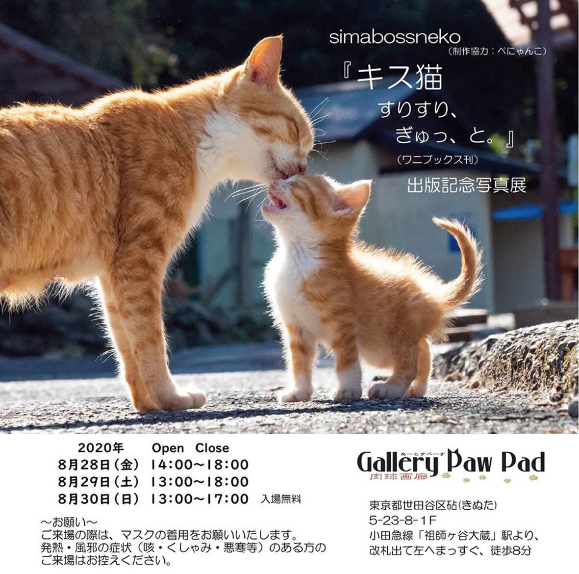 「おじさんと河原猫」写真展のお知らせ 2020年08月22日 今回は写真展のお知らせです ... 続きを読む 今回は写真展のお知らせです Gallery PawPad2020.9.5(sat)~9.12(sat)12:00~19:00世田谷区砧5-23-8地元のギャラリーでまたまたお世話になりますおじさんをいっぱい愛したシロシロを愛したおじさんシロを愛したおっさんがもうひとりいますが省略(笑)今回 皆さんにどうしても知って欲しかった猫を守り続け猫たちと多摩川に消えてしまったおじさん「高野さん」の写真も展示させていただきます書籍は9月13日(日)発売ですが先行して8日(火)にギャラリーに到着しそうです到着時間は今のところ未定となっておりますよろしければ足をお運びくださいねお待ちしておりますきてくれると うれしいニャン60過ぎて「うれしいニャン」とかこんな表現使うとは思わなかったわ来てニャン!