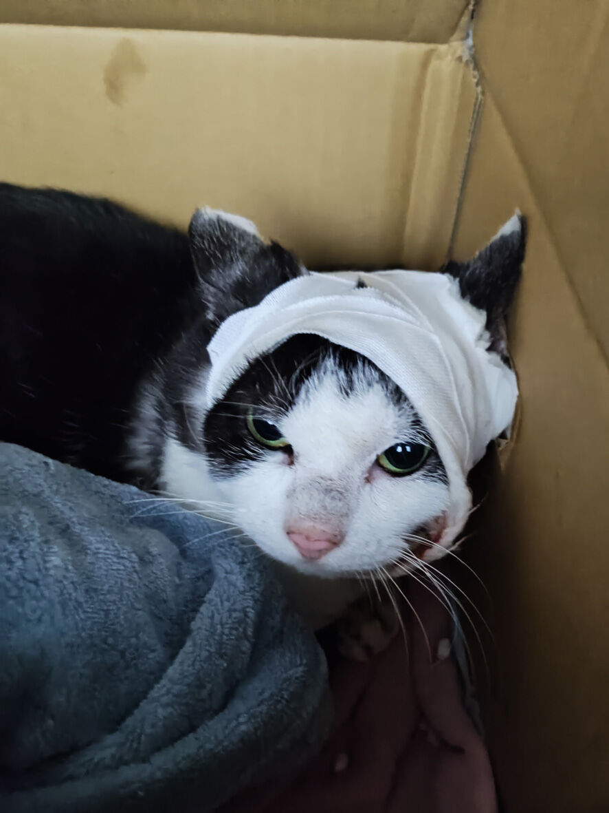 大晦日の朗報 2024年12月31日 18時頃だったでしょうか 「やりました! 捕まえましたよ!」とREDボクシングスポーツジムの会長さんから連絡がありました会長 ... 続きを読む 18時頃だったでしょうか 「やりました! 捕まえましたよ!」とREDボクシングスポーツジムの会長さんから連絡がありました会長は1週間ほど前から1匹の猫を気にかけていました知り合いの方から怪我をしている猫がいる何とかなりませんかと依頼があったのですその猫(会長撮影)この猫は右前脚を負傷右耳も何かおかしい口の中も良くないっぽい交通事故の疑いもあるといいます何とかならないかと相談して来られた方も最近 猫を保護して家に入れたばかりで保護するのは難しいいくつかの愛護団体にも相談されたそうですがそれぞれ大変で厳しいとのことで困っておられたところもう自分がやるしかないと会長が立ち上がったのです パチパチとふざけて書いていますが保護活動をしておられる人ならそれがどれだけ大変かよくご存じですよねこの大晦日の夜に捕獲器を仕掛け猫が入るのをじっと待つ保護出来ればできたで病院もやっていない中 自宅でケアかなり悩まれたことと思いますしかし決断したら仕事は早い今日の昼から捕獲器を仕掛けるもなかなか入ってくれない夕方 ついに手掴み! を実行し なんとか捕獲手は血まみれになったそうです・・・命名 たい焼きの「たいちゃん」スープを二口飲んだだけまあまだ来たばかりで緊張しているでしょうたいちゃんに何があったかは分かりませんが4日に病院が始まるまで待ちましょうそこで何かが分かるかもしれませんたいちゃんもう寒空の下で震えることなく傷も治療してもらって元気になろうねそして誰か優しい人に見初めてもらって幸せだけの記憶の上書きをしてもらいずっとお家で家猫として暮らすことでしょうたいちゃんの今後はこれからも報告していきますね
