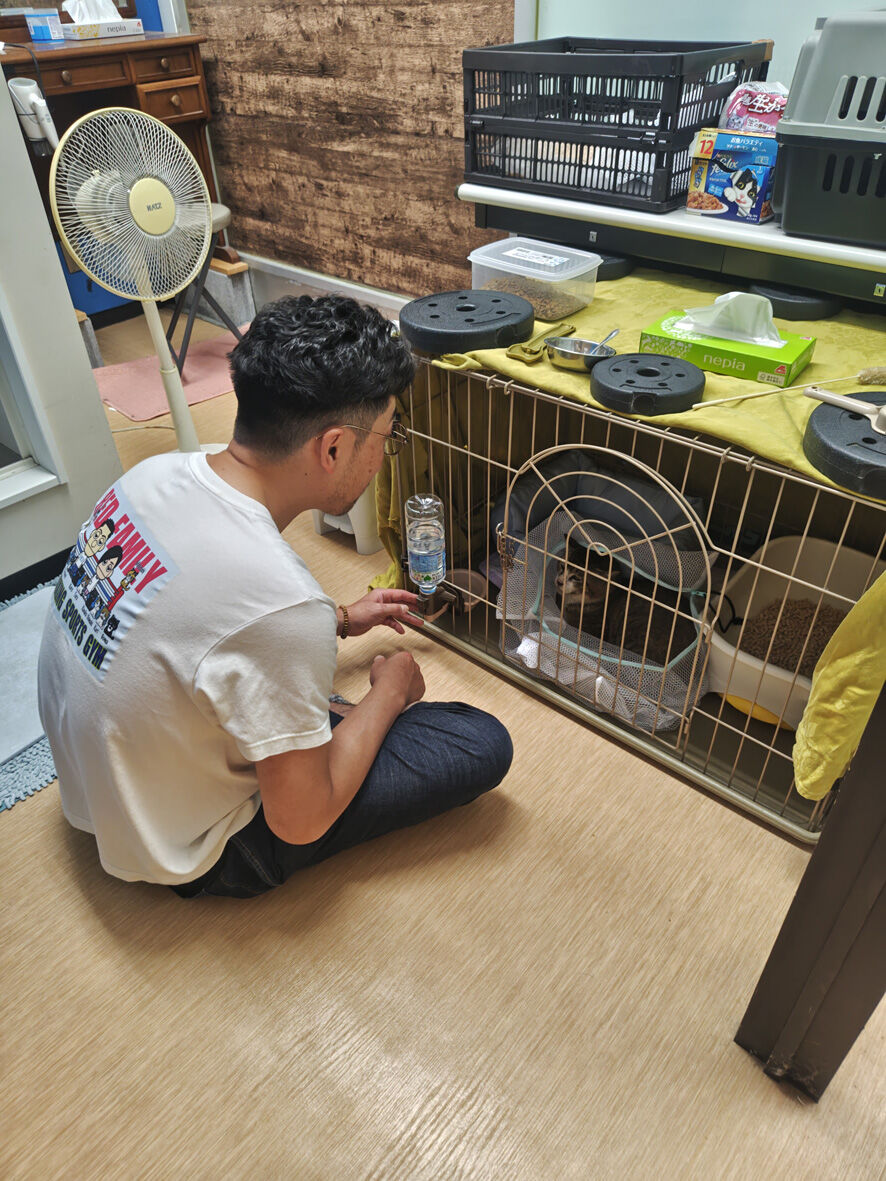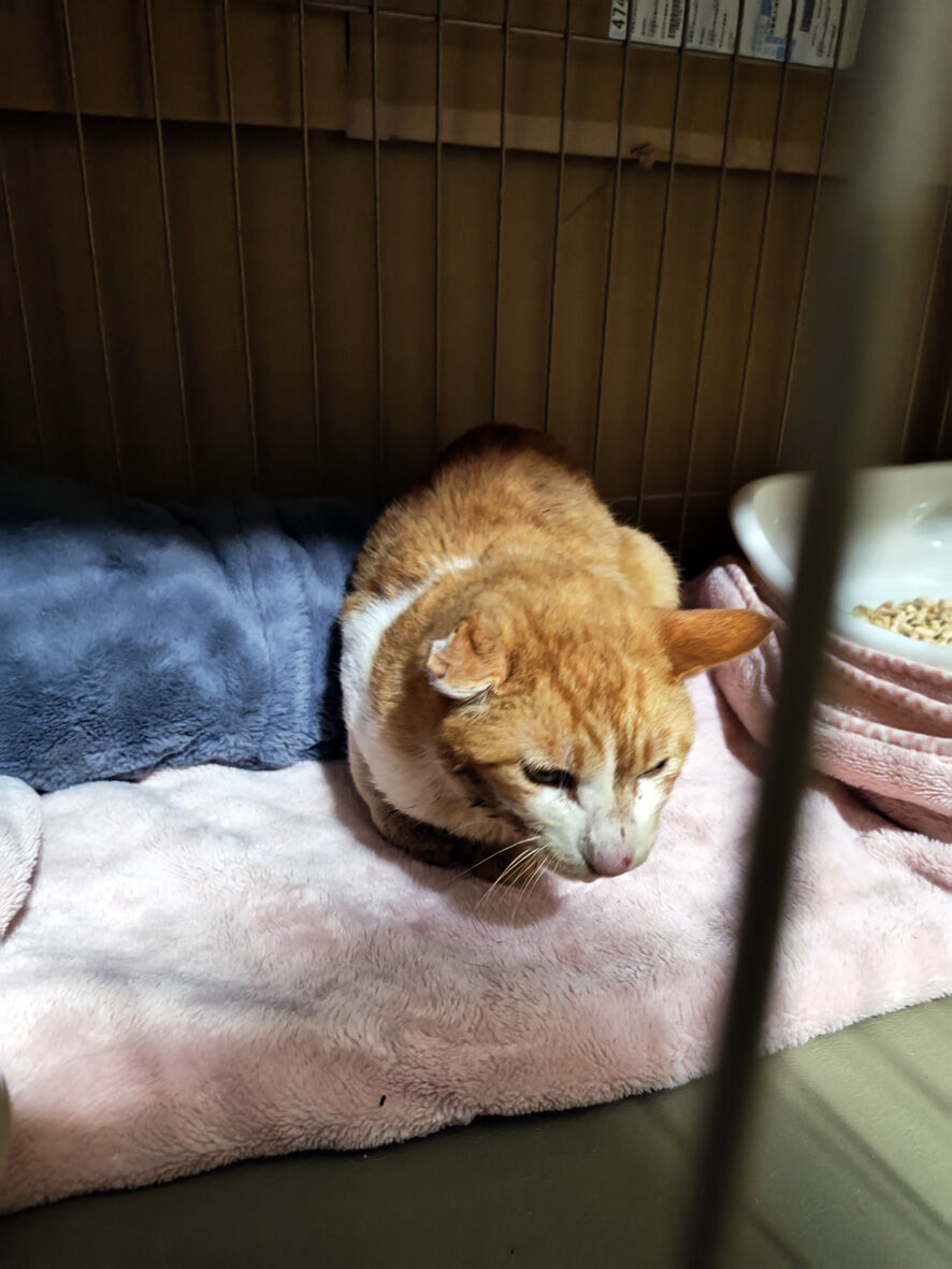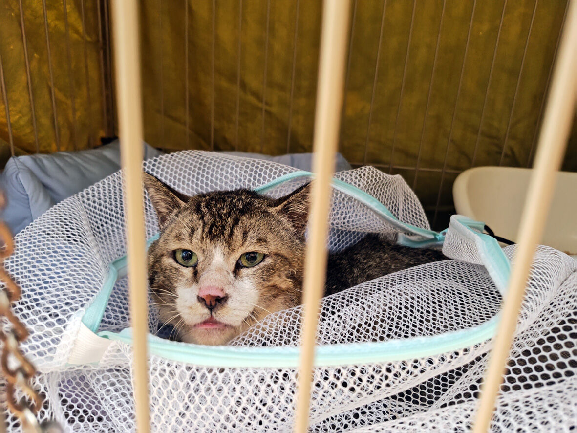 依頼レスキュー 2025年06月30日 SNSを何気なく見ていたら 怪我をしている猫を助けたい 捕獲のお手伝いをしていただけませんか#滋賀県という書き込みがあ ... 続きを読む SNSを何気なく見ていたら 怪我をしている猫を助けたい 捕獲のお手伝いをしていただけませんか#滋賀県という書き込みがありまして場所は滋賀のどこかと尋ねたらうちから45分そう遠くない場所でしたうちからももちろん出動できるけれど会長さんちの方が近いことから相談してみるとはい 行きましょう とふたつ返事で決定されたのですそうなったら会長さんの行動は早い詳しい内容を先方とDMでやり取りされて状況を把握毎晩餌やりをしている中の一匹の顔に傷があるとそのせいでご飯を上手く食べられないなのでその傷を治してやりたいでも捕獲が上手くできないということでしたもちろんそれは素晴らしいことなのでお手伝いすることに問題はないのだけれど心配なのは治療後その猫をどうするのかでした依頼者の方は学生さんでアパート住まい1匹の猫を飼っていてもうこれ以上は増やせないでも里親さんを見つけることができるかもしれない難しいかもだけどやってみたい話を伺った会長さんはその日のうちにリサーチで現場へこれなら捕まえられますよと連絡がありました会長さん撮影キジシロのどう見てもオス猫ですでも傷というよりは・・・歯が悪いか口内炎っぽいどちらにしても放っておけばこのまま悪化してご飯が食べられなくなり消えていくことになるこれは治療してやらないと翌日(昨夜になります)私も捕獲のため現場に向かいました現場に到着したら目標の猫は目の前に居ました慌てて捕獲器をセットし依頼者さんに猫を捕獲器に誘導していただくとそれほど時間もかからず捕獲成功猫は翌日うちの近くの病院で診てもらうため私が連れて帰りましたただいまー明日の朝一で診てもらうのでこのまま一晩置きます家の中の玄関は比較的涼しいので負担にはならないでしょう朝おはようお顔をちゃんと見せておくれ口臭と未去勢からなのかスゴイ悪臭だ口が痛くて毛づくろいもまともに出来ないひどい状態だということが分かりますとにかく病院だ5.3キロの身体暴れるわオシッコ漏らすわで大変でした顎が歪んでいる気もしますね と先生暴れるので良くは見えなかったけれどやはり歯も悪そう今日は爪切り 血液検査とフロントラインで終了本番は今週の金曜日麻酔をかけて去勢手術と抜歯にレントゲンちなみにエイズは陽性 白血病は陰性詳しい血液検査もしていただきその他の数値は健康そのものでした金曜日まではボクシングジムで預かって頂くことになってふー 到着会長さんすみませんお世話になりますジムのシャワールームにケージを設置日中は冷房が効いていて快適です絶対 故障してない(笑)会長さん素晴らしいですよ会長さん撮影なんかいい写真餌やりさんは「しんちゃん」と呼んでいるそうしんちゃん 金曜日まではゆっくりして去勢して歯も抜いたらスッキリするでしょうその後は里親さまも探してみよう君が幸せになるために頑張っている人がいるんだよ