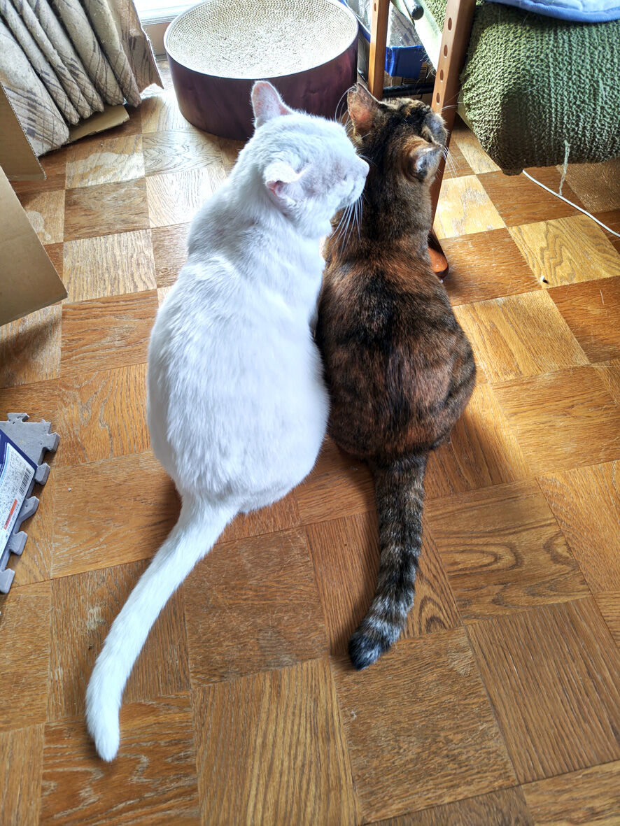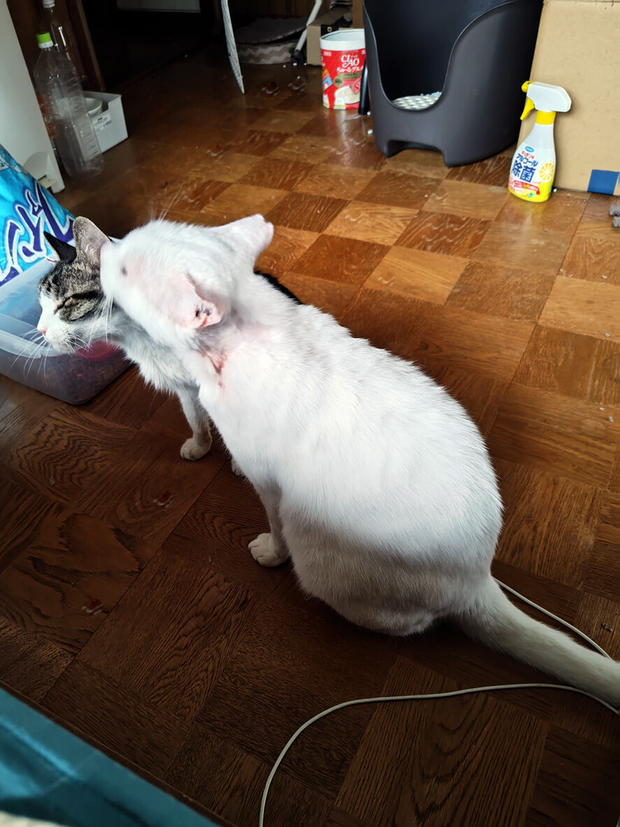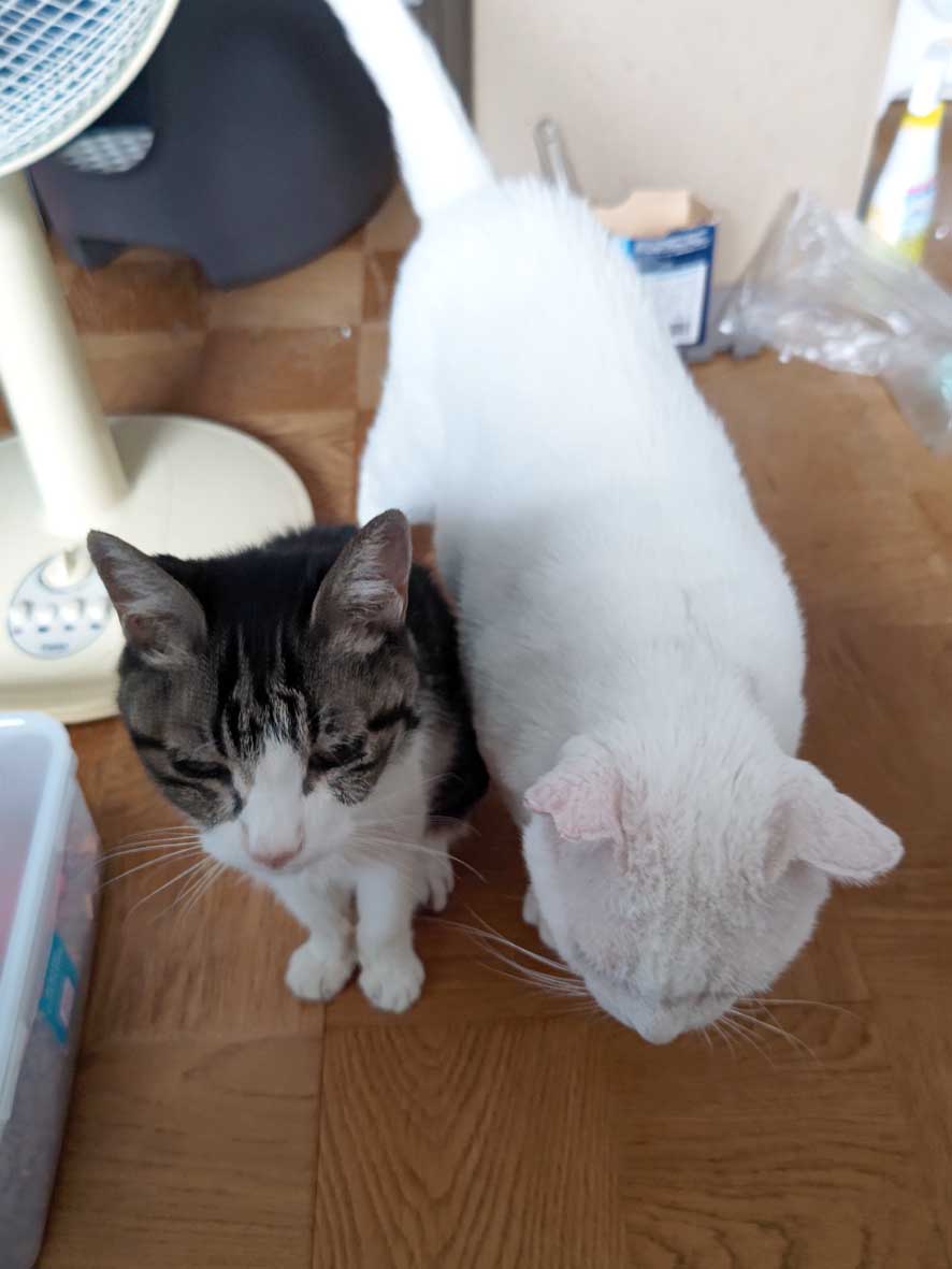 びわこねこ物語 怪我ねこしろた 2024年08月05日 しろたです 現在もうひとつパウチを試しています一週間経ちました皮膚には何ごとも起きていませんが少し首周りを掻く回数が増 ... 続きを読む しろたです 現在もうひとつパウチを試しています一週間経ちました皮膚には何ごとも起きていませんが少し首周りを掻く回数が増えたような気がしますあと少しだけ続けてみて「あからさまに」掻く回数が増えたらやめようと思います最近はチビも一緒にご飯を食べますチビはお年寄りだからしろたノリちゃんナス 皆 気を遣っている感じそしていつものポーズ(笑)チビも不思議がっていますしろたここ数か月いつのまにか外猫だった厳しいピリピリ感がなくなりました目を覚ましたら隣で眠っている しろたシャッターの音がしても起きませんこれじゃもう外では生きていけませんよねえ