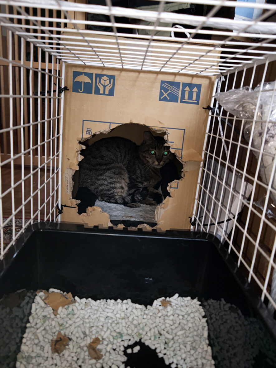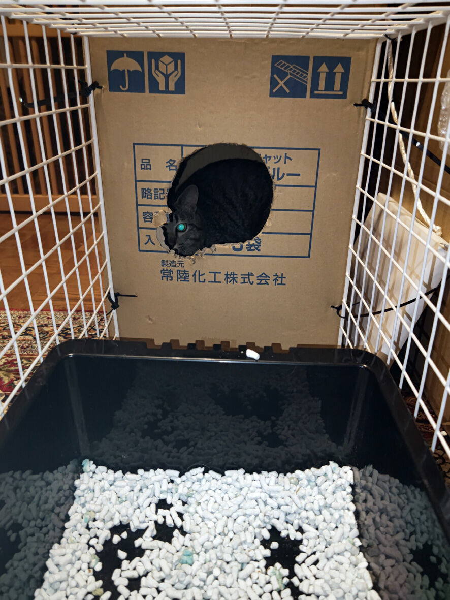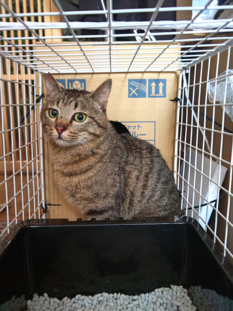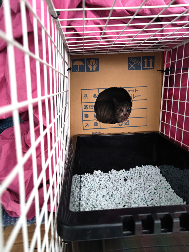 びわこねこ物語 イーウはおうちへ 2024年03月05日 本日 ... 続きを読む 本日 イーウを ずっと見守っておられたKさんちにお届けしてきましたよ過去記事参照イーウの捕獲イーウの災難とりあえず傷は塞がっていますしかし深かった傷なので中が心配そのため1か月後に再診することになりました退院は昨日になり一晩うちに置いておくのですが一晩くらいならキャリーケースでいいのではと先生に尋ねたら「イーウは夜にウンチをします」「だからキャリーケースでは可哀想」とたしなめられたのでしょうがなく例のものを出動させました天才の私が考案した数日くらいなら猫を保護しておける仮の住まい「カリスマイ1号」簡単に作れますので皆さん真似してもいいですよ手前のネットは100均で購入それを結束バンドで固定奥はトイレの砂が入っていた段ボールこの箱は重い猫砂が入っていたので分厚くて強いんですこの二つを合体しただけ箱とネットの固定も結束バンド但し箱に穴を開けただけだと強度がないので棒と一緒に固定しますこれなら少々の力が加わっても大丈夫たまたまサイズが合う箱でしたがこの箱よりも大きい分には問題ないと思いますその際も棒をかませることは忘れないようにしてくださいね(あまり大きいと猫が落ち着かないと思います)大事なのは今は説明用に上蓋を開いていますが猫に上が開くことを決して知られてはいけません上はガムテでくっつけてあるだけなのです(何か重石を乗せてもいいかもですね)ただ もし猫が逃げようとするなら視界が開けているネットの方でしょう箱は安心できる隠れ家になりますので中で暴れることはないと思いますですのでネットを固定する結束バンドはケチらずにたくさん使用してくださいこれで手前のネットはトイレ 水 フード用スペース箱は寝床スペースイーウも入れると吸い込まれるようにすぐに箱の中に入りました入ってしまえば飛び出ることはまずないのでその間にトイレや水餌容器を設置しますトイレは市販のものは大きいのでよくホームセンターで安売りしているコンテナを使いました車に積み込みKさん宅へイーウ これなら安心でしょ?ということでイーウは無事にKさん宅へケージへの移動させるのに課題は残りましたがなんとか用意してくださっていたケージに移し替えて私の役目は終了いたしました良かったね イーウ