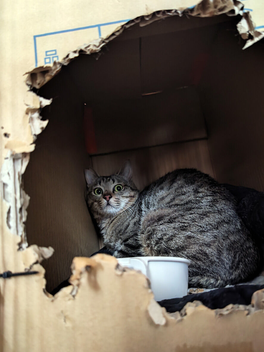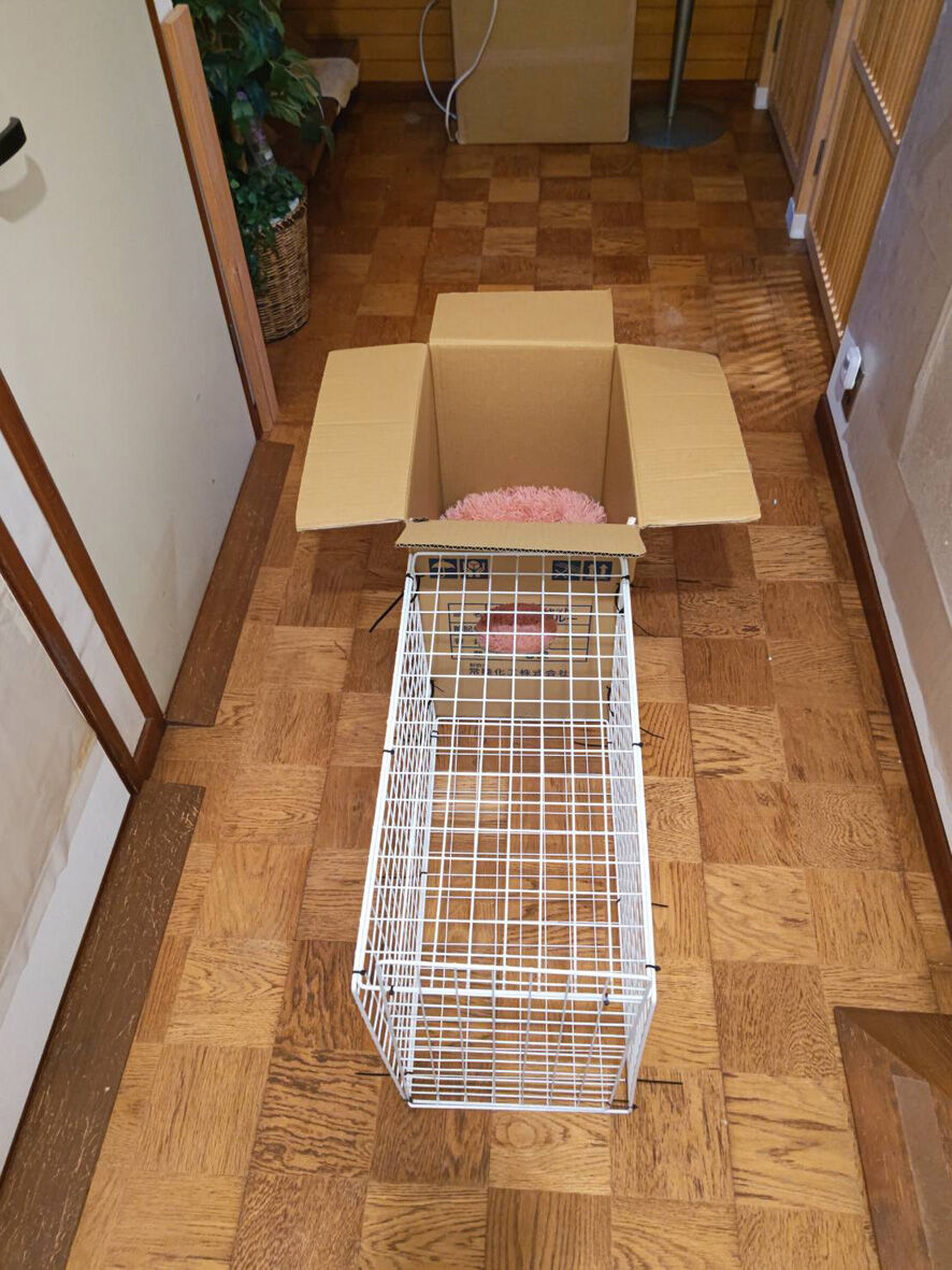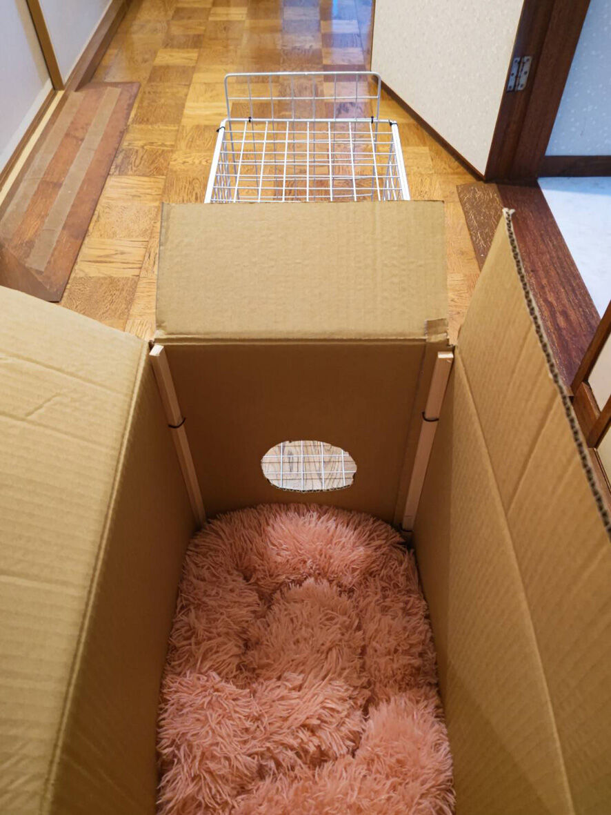 びわこねこ物語 イーウはおうちへ 2024年03月05日 本日 ... 続きを読む 本日 イーウを ずっと見守っておられたKさんちにお届けしてきましたよ過去記事参照イーウの捕獲イーウの災難とりあえず傷は塞がっていますしかし深かった傷なので中が心配そのため1か月後に再診することになりました退院は昨日になり一晩うちに置いておくのですが一晩くらいならキャリーケースでいいのではと先生に尋ねたら「イーウは夜にウンチをします」「だからキャリーケースでは可哀想」とたしなめられたのでしょうがなく例のものを出動させました天才の私が考案した数日くらいなら猫を保護しておける仮の住まい「カリスマイ1号」簡単に作れますので皆さん真似してもいいですよ手前のネットは100均で購入それを結束バンドで固定奥はトイレの砂が入っていた段ボールこの箱は重い猫砂が入っていたので分厚くて強いんですこの二つを合体しただけ箱とネットの固定も結束バンド但し箱に穴を開けただけだと強度がないので棒と一緒に固定しますこれなら少々の力が加わっても大丈夫たまたまサイズが合う箱でしたがこの箱よりも大きい分には問題ないと思いますその際も棒をかませることは忘れないようにしてくださいね(あまり大きいと猫が落ち着かないと思います)大事なのは今は説明用に上蓋を開いていますが猫に上が開くことを決して知られてはいけません上はガムテでくっつけてあるだけなのです(何か重石を乗せてもいいかもですね)ただ もし猫が逃げようとするなら視界が開けているネットの方でしょう箱は安心できる隠れ家になりますので中で暴れることはないと思いますですのでネットを固定する結束バンドはケチらずにたくさん使用してくださいこれで手前のネットはトイレ 水 フード用スペース箱は寝床スペースイーウも入れると吸い込まれるようにすぐに箱の中に入りました入ってしまえば飛び出ることはまずないのでその間にトイレや水餌容器を設置しますトイレは市販のものは大きいのでよくホームセンターで安売りしているコンテナを使いました車に積み込みKさん宅へイーウ これなら安心でしょ?ということでイーウは無事にKさん宅へケージへの移動させるのに課題は残りましたがなんとか用意してくださっていたケージに移し替えて私の役目は終了いたしました良かったね イーウ