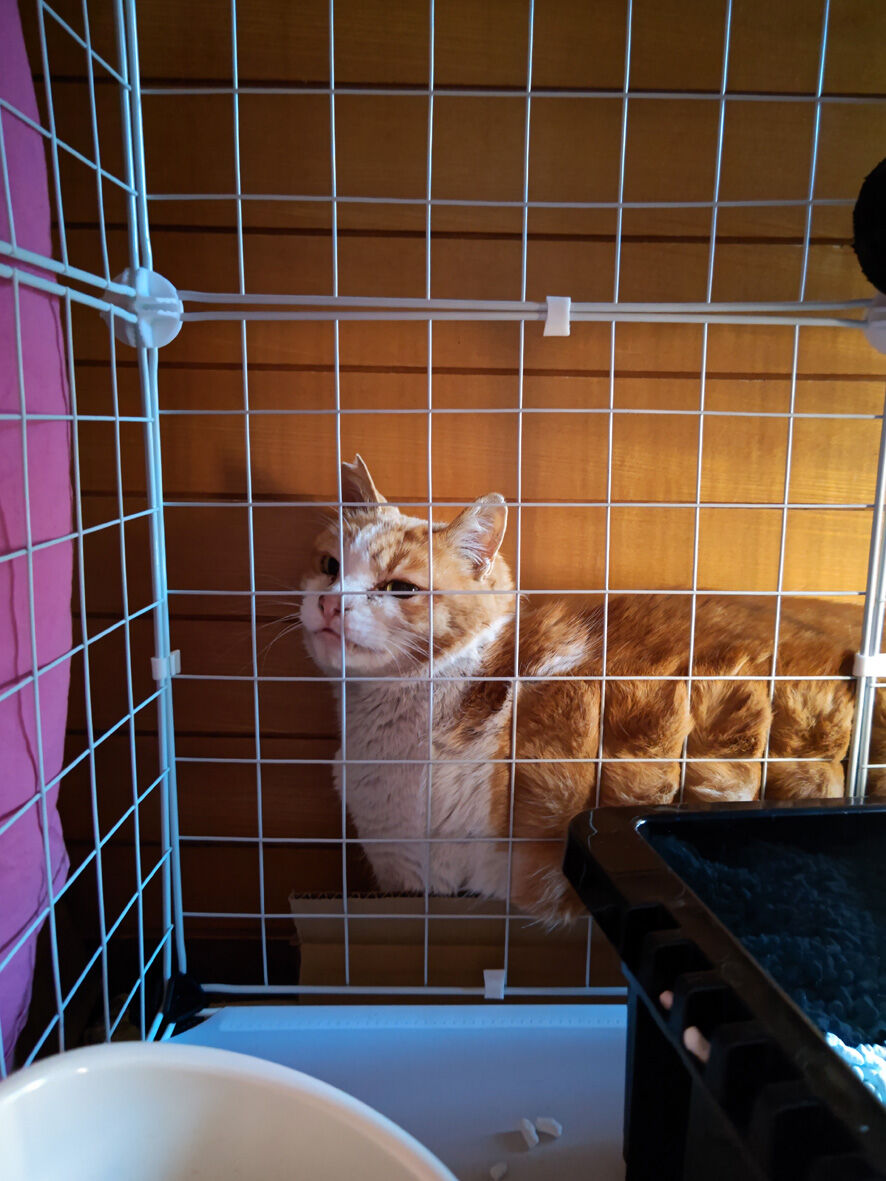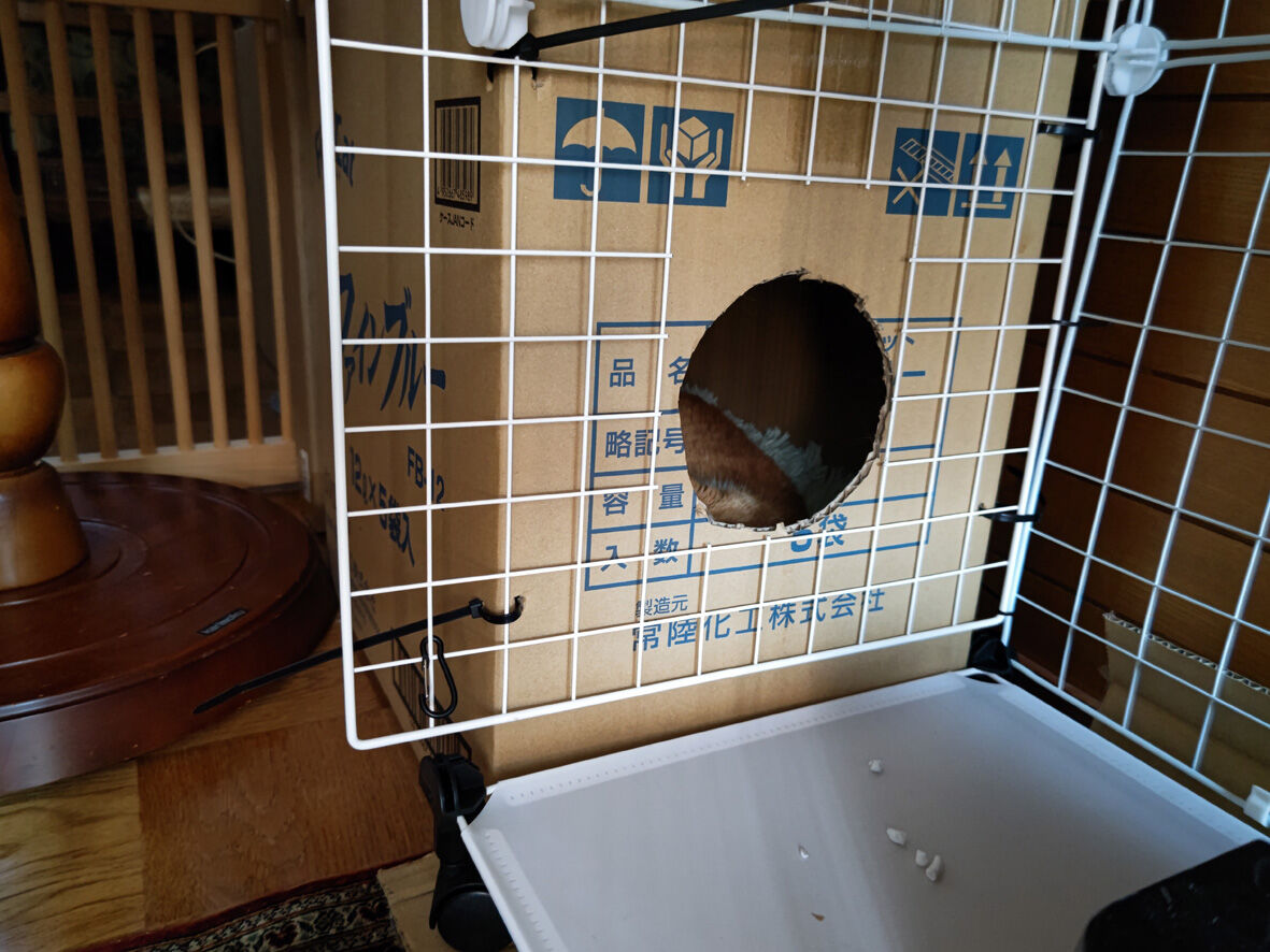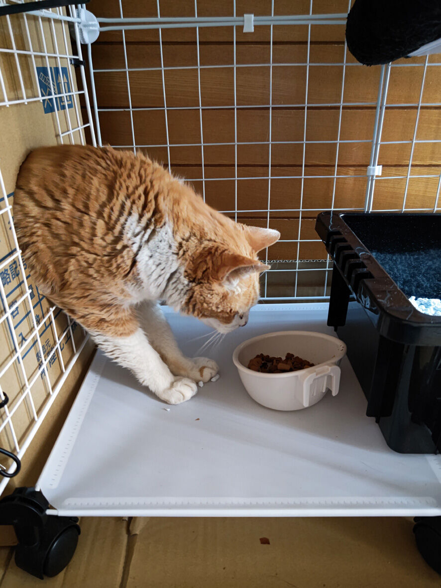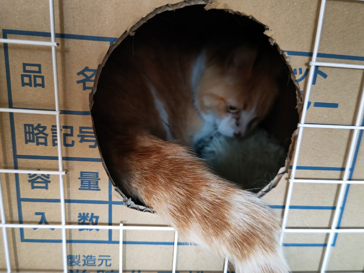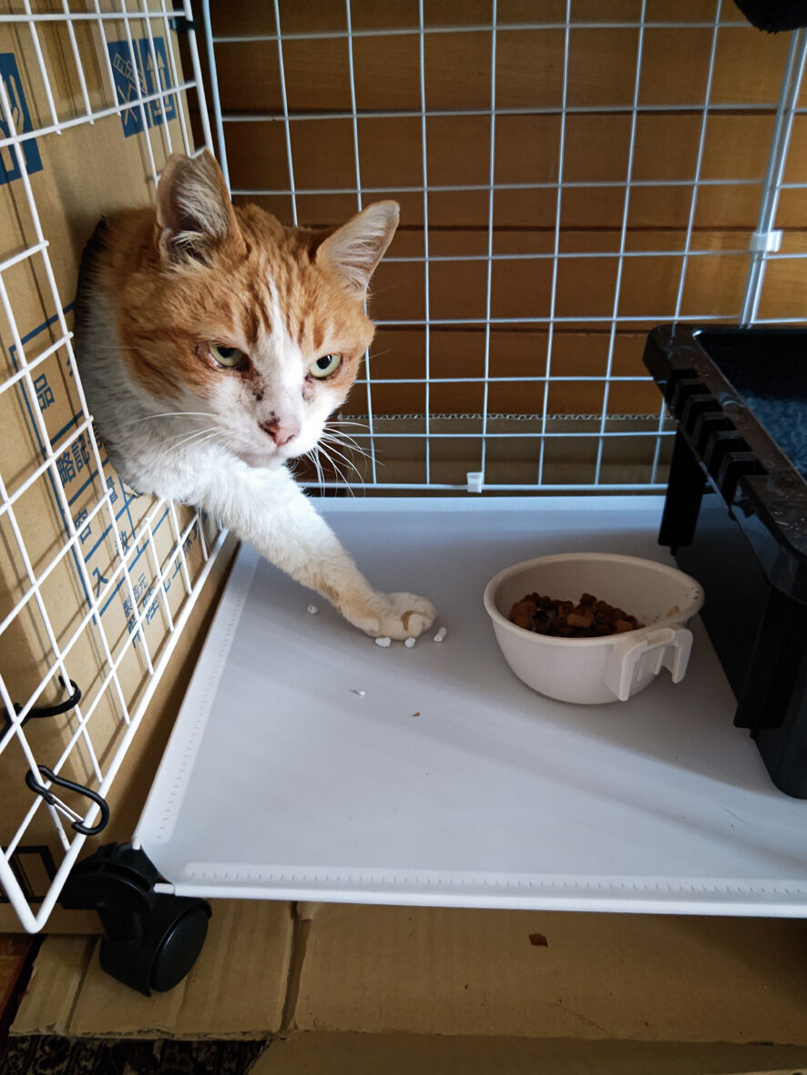 近所のねこ ペロ 3 2024年02月13日 うちにいるねこたちの問題が山積です ... 続きを読む うちにいるねこたちの問題が山積です チビの甲状腺機能亢進症と癲癇チーの脚の腫瘍と末期の腎不全しろたのアレルギーノリちゃんはかわいいけどお転婆ナスは底なしの食いしん坊ゴローは撫でさせてくれるけど無反応そしてペロペロのためにケージを用意しましたがケチって安いものしましたというか玄関に大きいものを置くと各方面からカミさんからクレームが入るからしょうがないのですでも寛げる場所がこの狭さこれではあまりにもあまりにもですねどうしようかと考えながら一晩をこのままで過ごしてもらいました翌朝ペロ逃げてるよーってカミさんが教えてくれましたこちらのケージは扉のロック機能などがないタイプ勝手にしてくださいということになっているこちらも何でロックするか悩みとりあえずあるもので間に合わせたそれがクリップという簡単なものにしていたからしょうがないせまかったにゃーんごめんなあケージの外に出ても玄関扉さえ閉まっていれば大丈夫なんだけどそれでもケージには慣れてもらわないといけない譲渡しても初めはケージ暮らしだからね壁とケージの間に挟まってる(笑)これは私から逃げ回っているのではなく安心な場所を求めて入り込んだのですペロは捕まえようと思えばいつでも捕まえられますちょうどケージから出ていれば都合がいい今の間に朝にひらめいたケージ内 快適生活プランを実行することにとにかくケージが狭くてペロが落ち着ける場所がないことがペロにとってストレスだだから脱出を考えてしまうのは当たり前ならば快適に過ごせる場所を提供してやればいいペロのおうちをドッキングわたしって天才じゃないですか?暖房のない玄関これなら暖かくして眠ってもらえるし周りが囲まれているため安心でしょう中にはフカフカのクッションが入ってますさっそく入ってくれましたよネットを切断した部分はヤスリをかけて丸くなっていますのでケガはしないはず満足しているペロでも満足しているのだけど今度は出てこなくなってしまった(笑)まあまだ保護して2日目です顔も身体もきれいにしてもっともっと馴らして人間大好きになってもらって里親募集サイトに載せてみようと思いますペロかわいいですよ気になるかたotacat@ymail.ne.jpこちらまで連絡ください