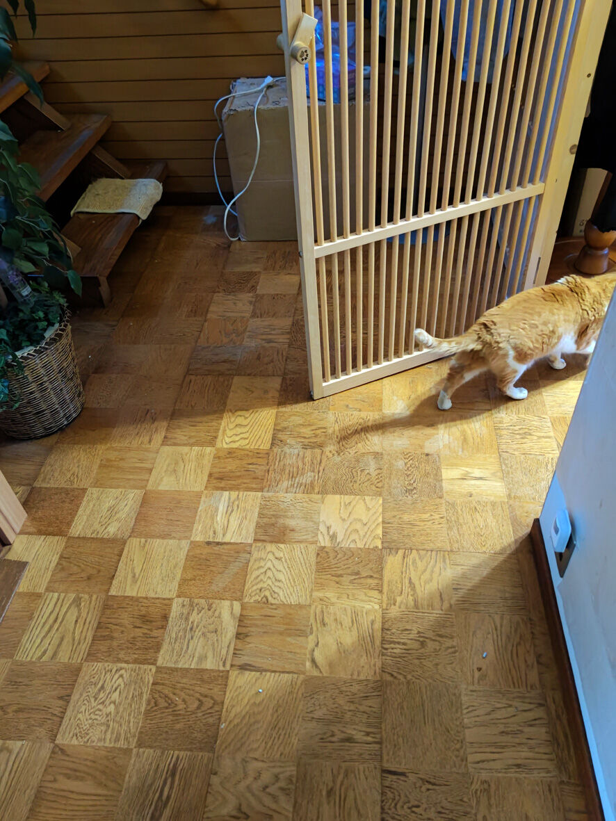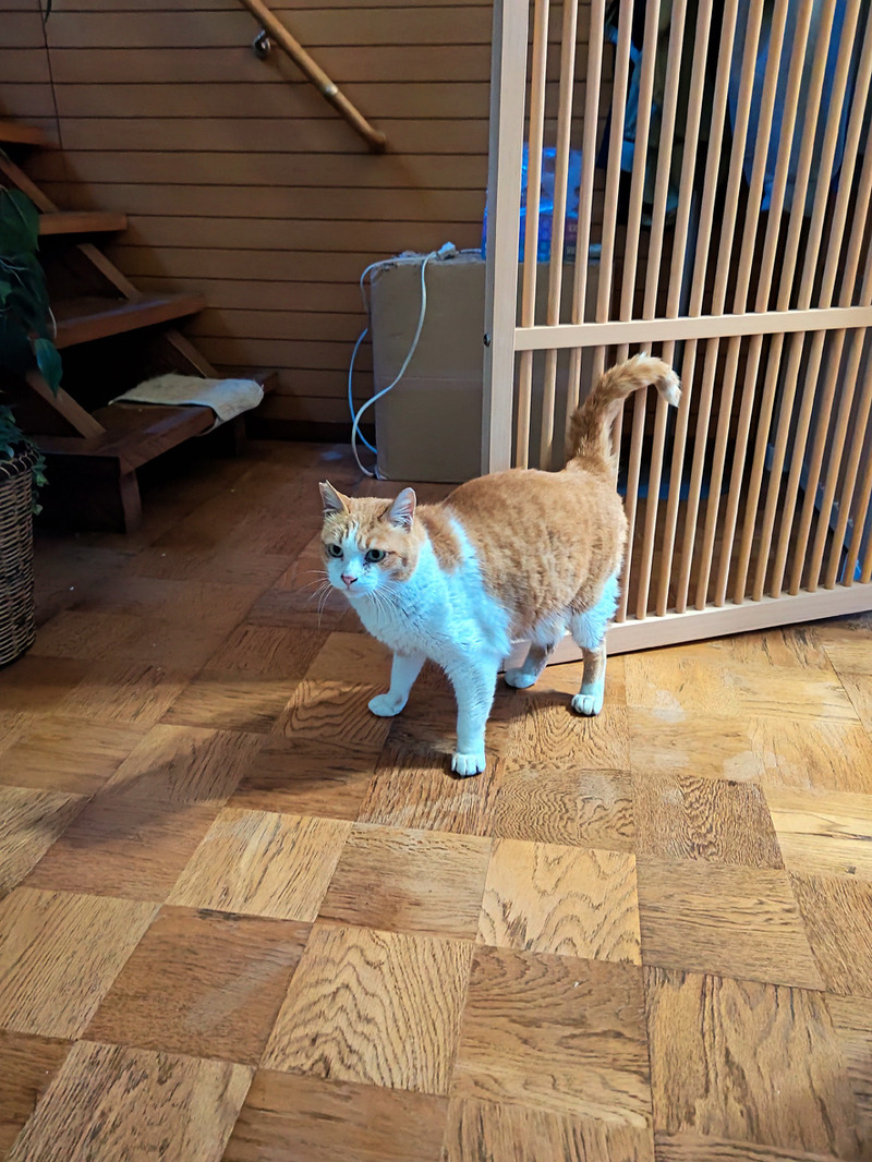 近所のねこ ペロ 9 2024年02月25日 階段ペロです ... 続きを読む 階段ペロです ペロが階段を上るようになりましたおおっためらいもせずにスイスイと上っていくそして2階にある二つの部屋その前まで行ったと思われます私は下にいて確認できていないのですが声が聞こえましたウゥゥゥ~~~誰かが怒っていますその後ぱたぱたと階段を降りてきたペロ怒られたか ペロさすがにそう簡単には皆に受け入れてもらえなかったねまあ のんびりやりますかね玄関に置いていたペロのケージカミさんが「家の出入りに気を遣ってしょうがない」「脱走防止柵の内側に入れてやりなさい」と言うのでハイッ 承知いたしました!と ペロは廊下に来ましたよ